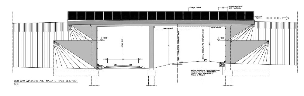 Η γεφύρωση επιτυγχάνεται με πλαίσιο αποτελούμενο από τρία τοιχοειδή βάθρα μονολιθικά συνδεδεμένα με πλάκα ζυγώματος δύο ανοιγμάτων, από οπλισμένο σκυρόδεμα, με ελεύθερα εσωτερικά ανοίγματα 15,12μ. (για τη διέλευση των δυο σιδηροδρομικών γραμμών) και 11,00 μ. (για τη διέλευση του SRL2).
