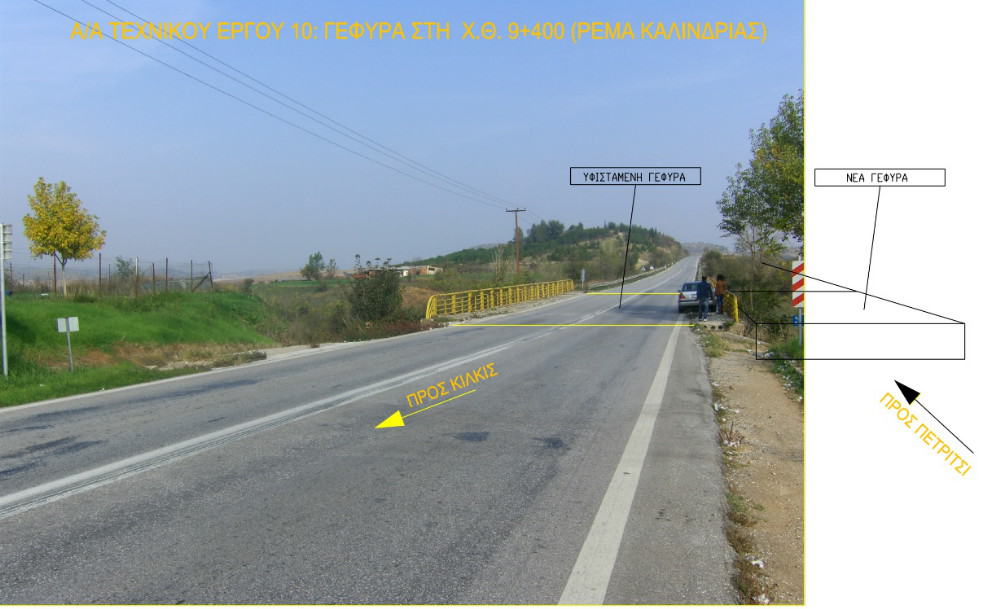 <Τ10>: Πρόκειται για τεχνικό έργο γεφύρωσης φυσικής μισγάγγειας στη Χ.Θ. 0+287,94 για την εξυπηρέτηση του ΔΕΞΙΟΥ κλάδου της αναβαθμιζόμενης αρτηρίας Σταυροχώρι-Δροσάτου Νομού Κιλκίς. Το νέο τεχνικό θα κατασκευασθεί παράλληλα από το υφιστάμενο ενός αμφιέρειστου ανοίγματος της τάξης των 36,50 μ., το οποίο θα εξυπηρετεί την κίνηση του ΑΡΙΣΤΕΡΟΥ κλάδου του αυτοκινητόδρομου. Εκπονήθηκαν και εγκρίθηκαν Προκαταρκτική και Οριστική μελέτη.