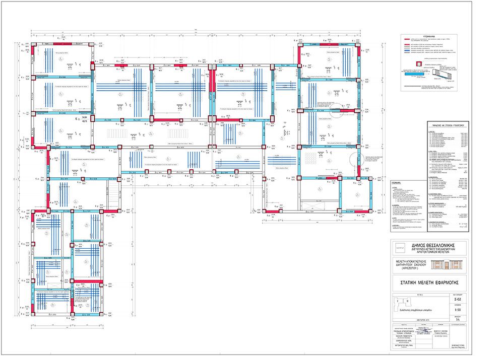 Μελέτη επισκευής και αποκατάστασης της στατικής επάρκειας του διατηρητέου σχολείου επί της οδού Κριεζώτου 2 στη Θεσσαλονίκη, κατασκευής 1936. Διώροφο κτίριο με υπόγειο συνολικής επιφάνειας 2.305 μ2 . Εκπονήθηκαν Οριστική Στατική μελέτη, Στατική Μελέτη Εφαρμογής, Τεύχη Δημοπράτησης και εκδόθηκε Άδειας Δόμησης. Εφαρμογή push-over analysis και Κανονισμού Επεμβάσεων (ΚΑΝ.ΕΠΕ.)